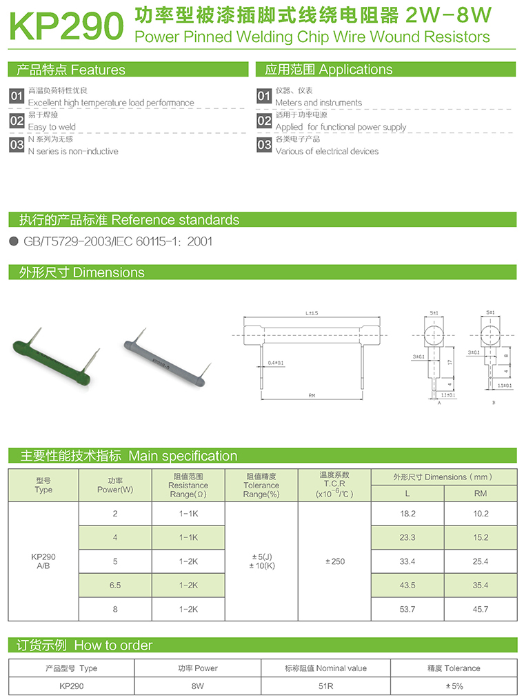 KP290功率型被漆插脚式线绕电阻器